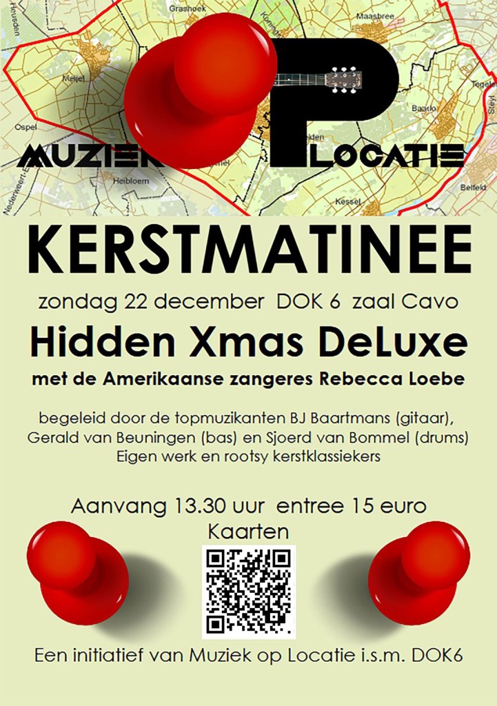 Rebecca Loebe maakte in 2011 naam in Amerika als deelneemster aan the Voice. Op 22 december staat de Texaanse countryzangeres op het podium bij DOK6 (zaal Cavo) tijdens het kerstmatinee Hidden Xmas DeLuxe. Met BJ Baartmans (gitaar), Gerald van Beuningen (bas) en Sjoerd van Bommel (drums). Aanvang 13.30 uur. De entree bedraagt 15 euro.